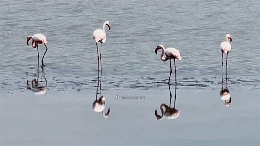 Und das war es dann mit flüssigem Fahren. Die ersten Flamingos in Sicht. Das Rad stellen wir ab und schleichen uns vorsichtig an. Wir nehmen auch den grottenhässlichen Bagger im Hintergrund in Kauf und knipsen und filmen in allen Varianten, nicht wissend, dass wir noch ca. 1.000 Flamingos oder mehr erspähen werden. Die ersten Fotos haben wir übrigens schon gelöscht.