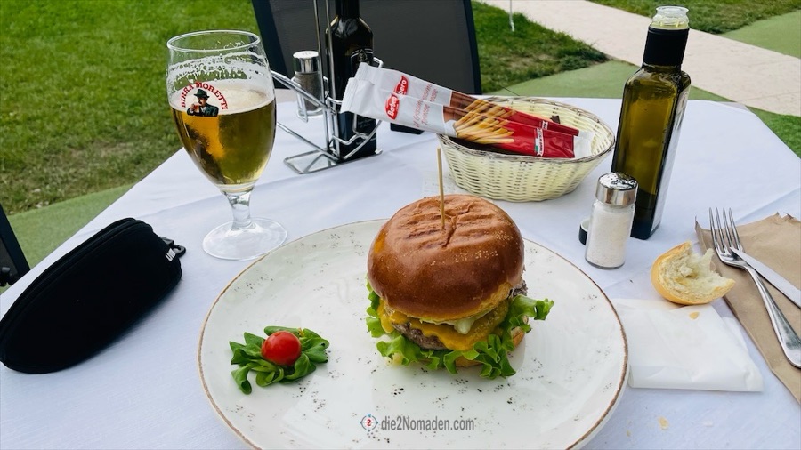 Ein Lokal, vor dem eine Schwanfamilie ihr Domizil aufgeschlagen hat, bietet mir einen Burger, aber ohne Pommes („der Koch ist erst ab 18:00 Uhr wieder da.“ 🤯) an.