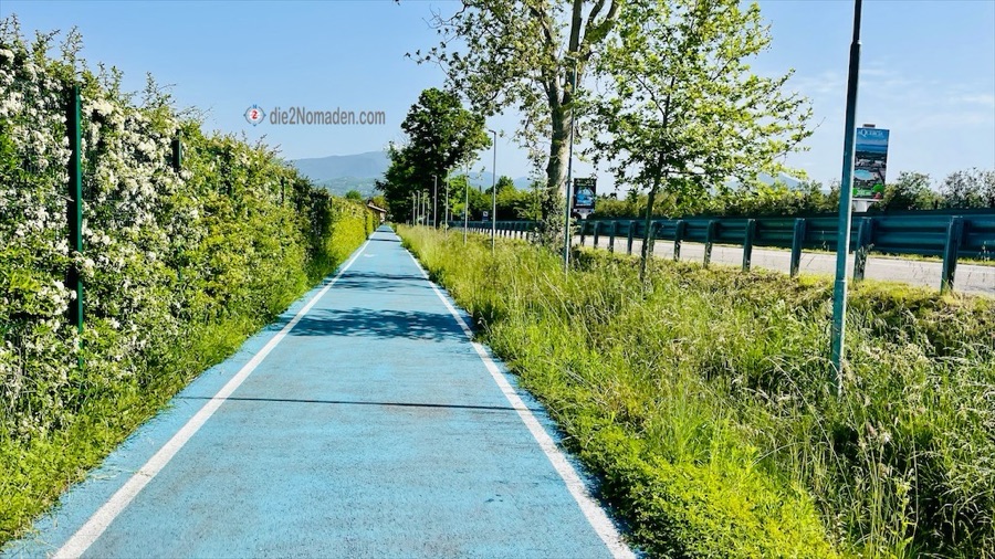 Mir vollem Magen schlängle ich mich wieder aus Lazise zurück auf meinen Trail. Es geht nun durch entlegene Örtchen und so erreiche etwa eine Stunde später den Ort Colà, und danach Pacengo, wo ich wieder auf die „Zivilisation“ treffe.