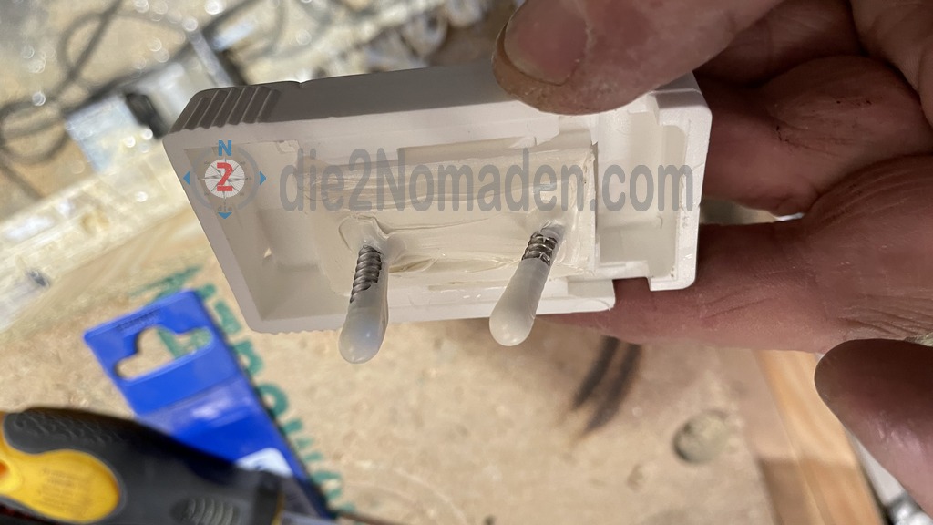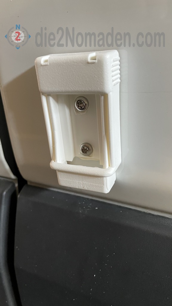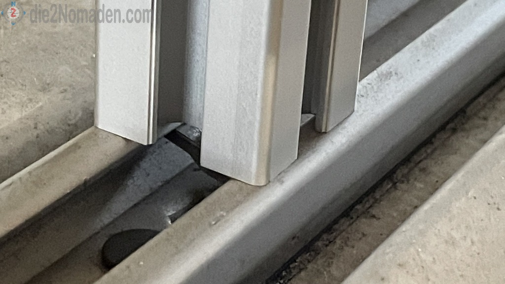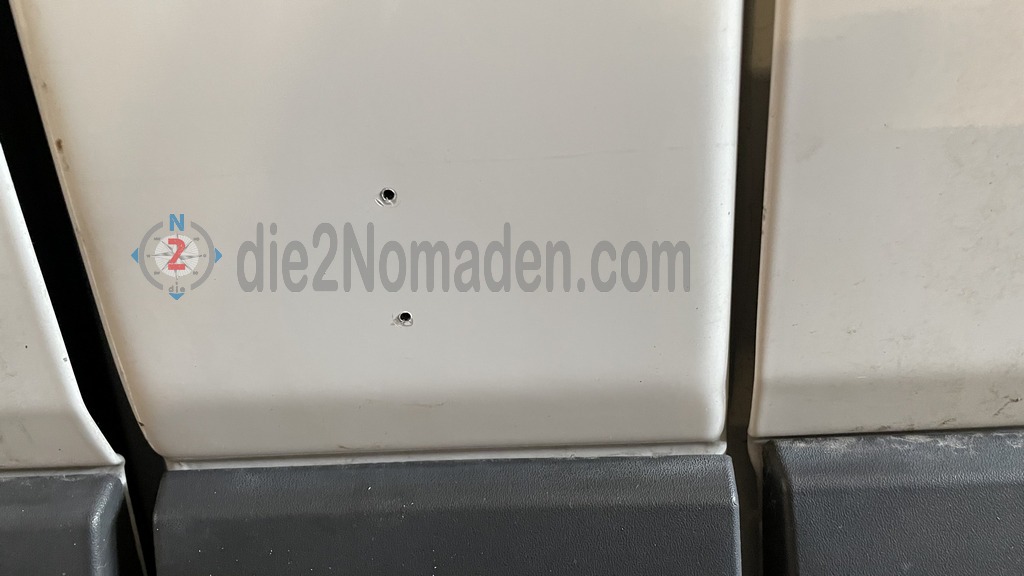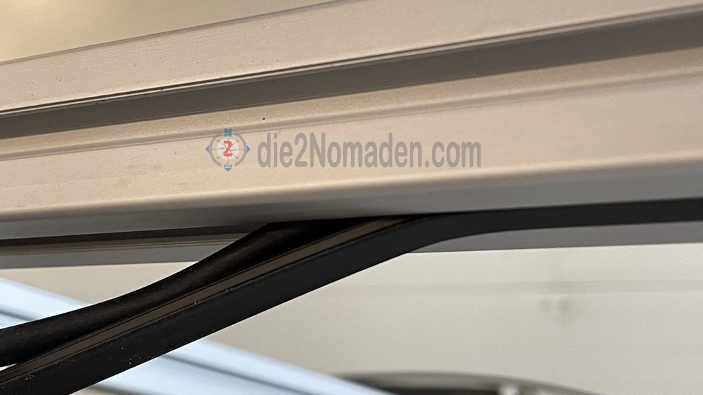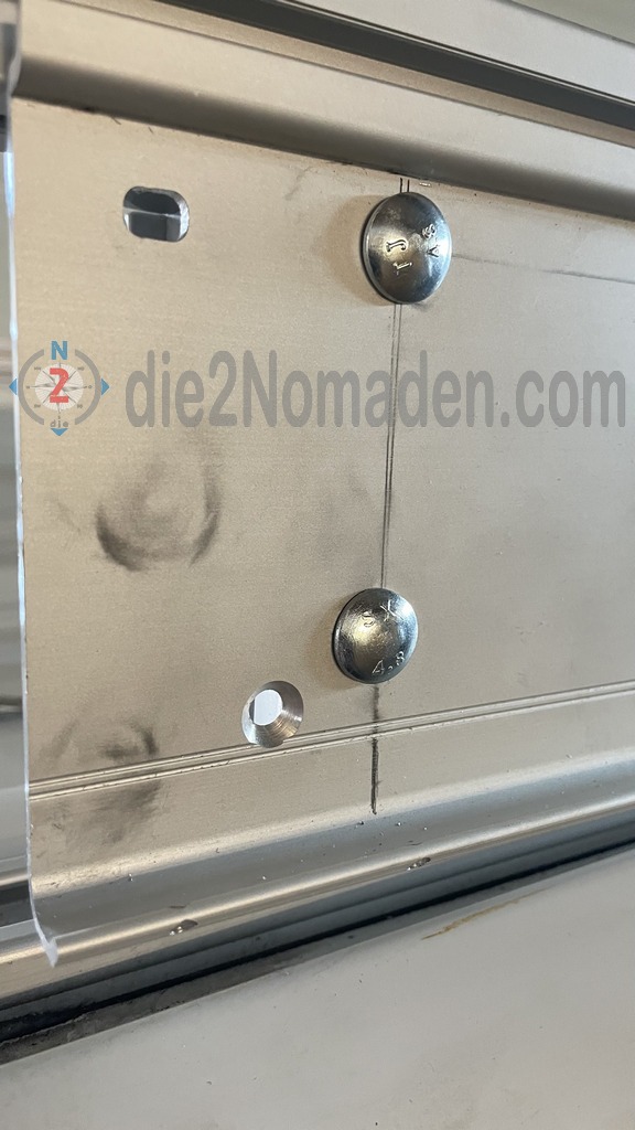 An der B-Säule unten vor der PVC-Verkleidung, sowie ca. 3 m weiter hinten werden nun noch die Wandhalterungen für die Markise abgedichtet, verklebt und zusätzlich verschraubt. Diese Halter dienen der Aufnahme der vertikalen Stützen der Markise, damit sie nicht am Boden fixiert werden müssen.