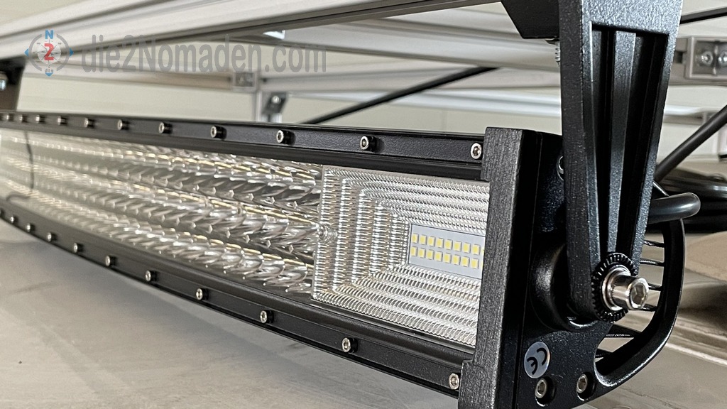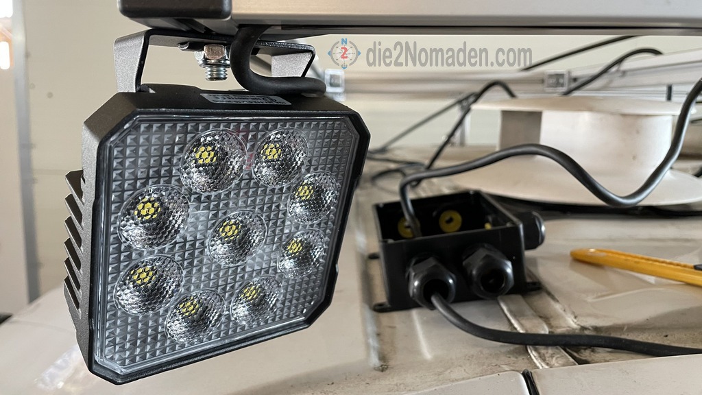 Seitlich und an der Rückseite wurde je ein 15 W Hella-Scheinwerfer am Systemprofil befestigt. Die Verkabelung der Beleuchtungskörper erfolgt in den Nuten der Profile und ist somit „fast“ unsichtbar.