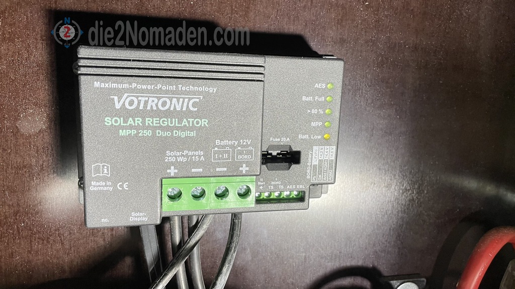 Hier haben wir einen MPPT-Solarregler der Firma Votronic verbaut, an dem nun die Leitungen des Paneels verkabelt werden.