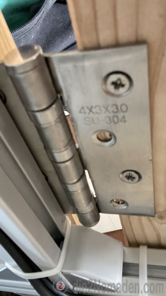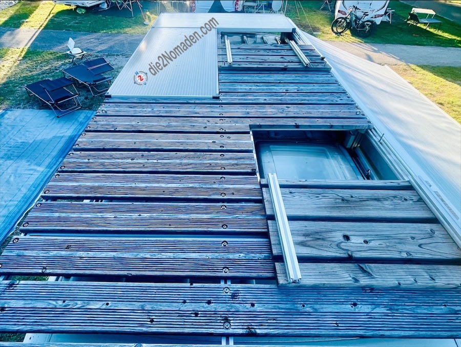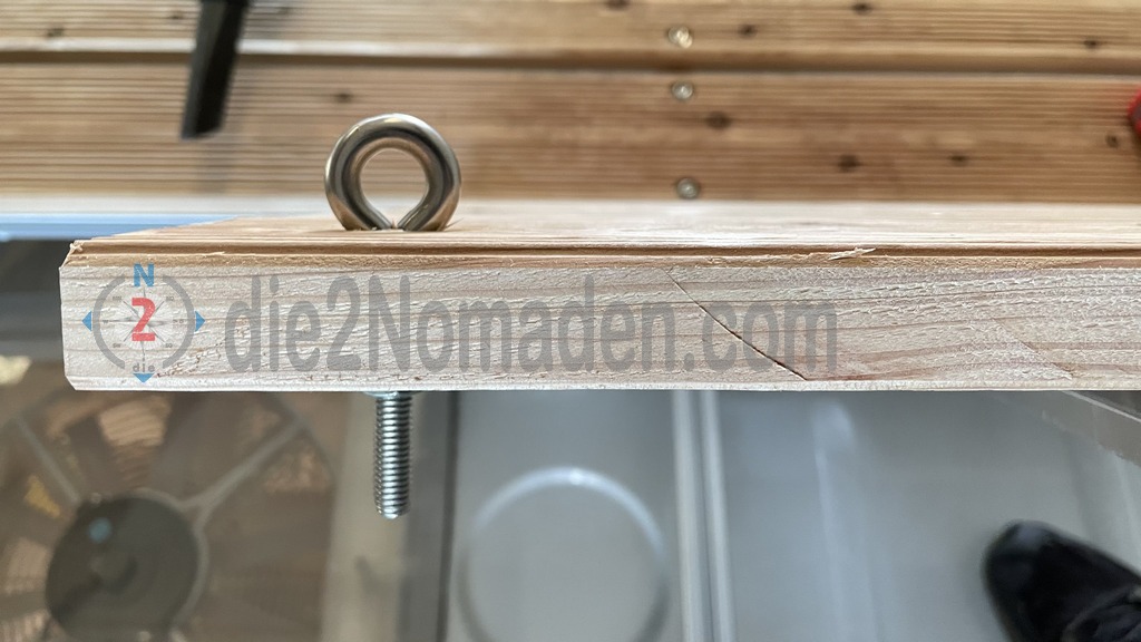 Im vorderen Bereich des Trägers wurden die Dielen über zwei Klappbeschläge als Lehne konzipiert. Ringschrauben wurden im oberen Bereich der Lehne und am Grundträger montiert. Durch zwei Seile und vier Karabiner bleibt die Lehne in angenehmer Sitzposition. Bei der Fahrt wird die Lehne wieder gesenkt und mittels Rädelschrauben mit dem Grundträger verschraubt. Das gleiche Klappsystem wird über der hinteren Dachluke ebenfalls montiert, nur diese bleibt während der Fahrt offen und wird nur geschlossen, wenn wir uns auf der Dachterasse befinden oder eben auch als Schutz vor Unwetter, wie Hagel, Äste, o.ä.