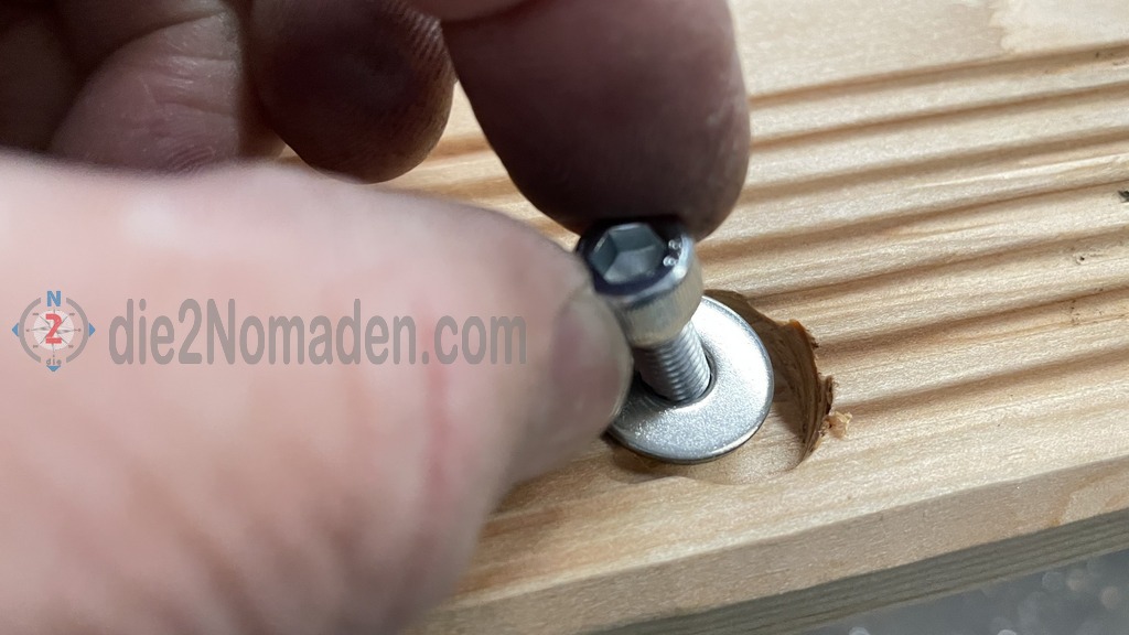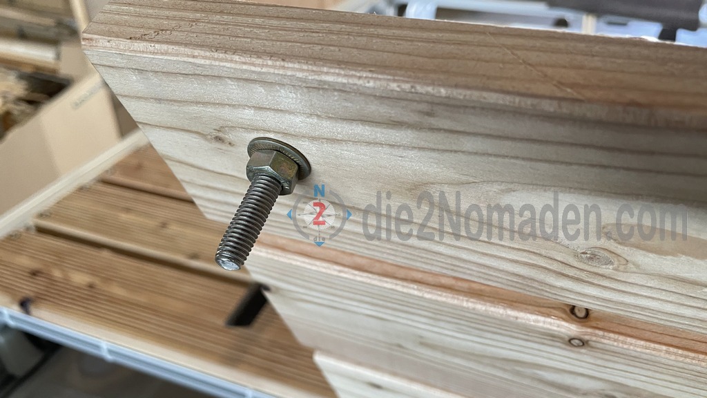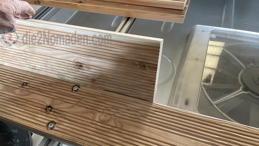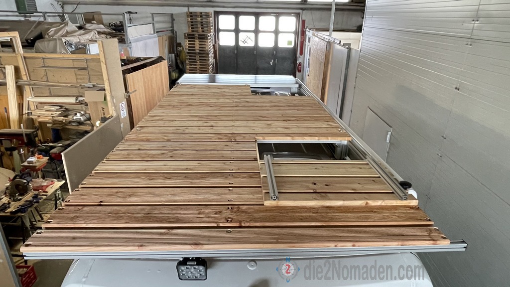 Am restlichen Teil des Dachträgers werden nun Douglasie Terassendielen verlegt. Da dieses Holz sehr leicht ist, wird somit auch Gewicht gespart. Die Dielen wurden mit Zylinderschrauben mit Innensechskant, Beilagscheiben und Hammermutter Nut 8 M4 B-Typ an den Bosch-Profilen verschraubt.