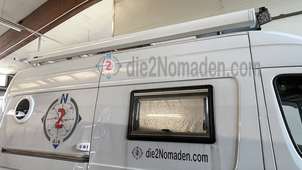 Beifahrseitig wurden die Stützen „aufgedoppelt“. Dadurch ist die Montageplatte für die Markise plan mit dem Grundgerüst des Dachträgers. Mittels Schlossschrauben M6x80, Beilagscheiben und Muttern wurde die Montageplatte am Grundträger fixiert. Anschließend wurde die 2,5 m Markise vom Typ Thule Omnistore 5200 von oben in die Platte eingehängt und von unten die Markise mit der Montageplatte verschraubt. Da mir die 3 Schraubpunkte zu wenig erschienen, habe ich noch einige weitere entlang der Markise gebohrt und verschraubt.