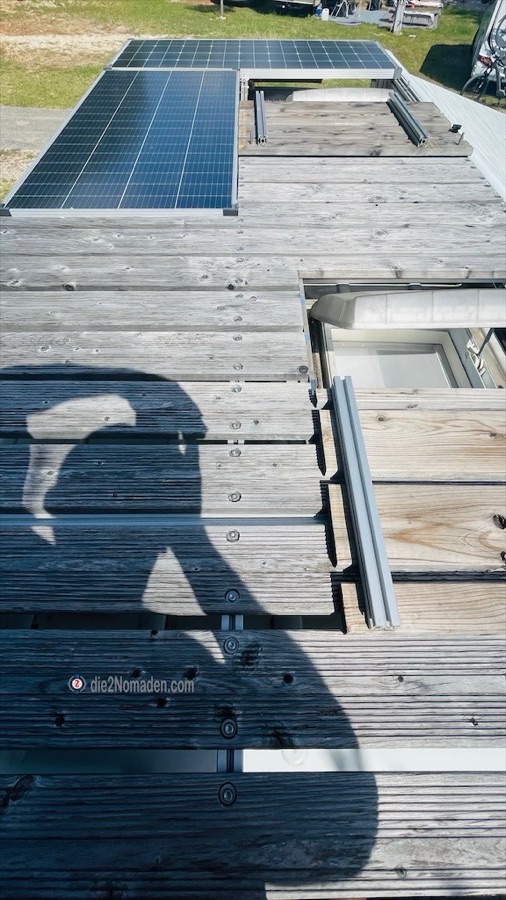 Das zweite 36V monokristalines 180W-Paneel von Enjoy-Solar wurde, wie oben beschrieben, fahrerseitig längs, direkt an das erste Paneel montiert. Die aufstellbare Lehne bleibt erhalten, wird jedoch um die Breite des Paneels verkürzt.