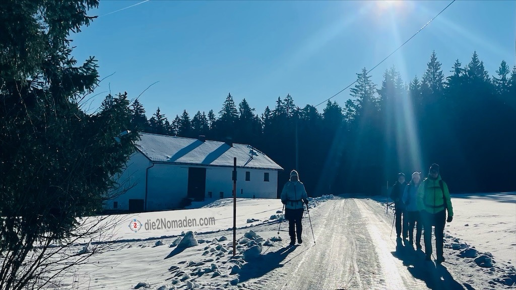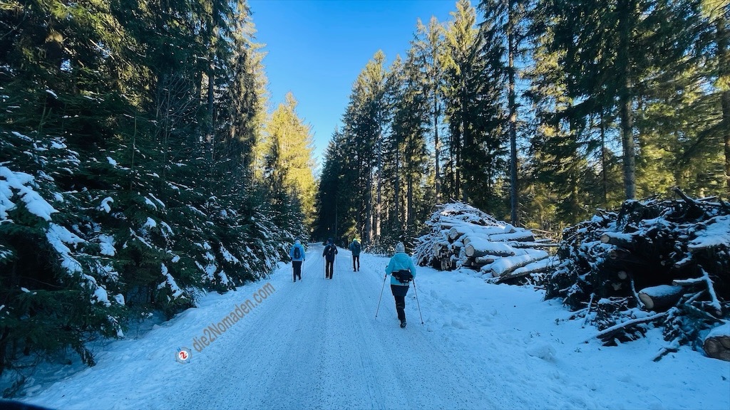So geht es einen gefrorenen Wirtschaftsweg, an dem die Traktorspuren tiefe Rinnen und zum Gehen unangenehme Rillen für uns bereit hält, entlang durch den idyllischen, dichten Winterwald. Die meisten von uns packen nun die Wanderstöcke aus, um etwas mehr Sicherheit bei diesen eisigen Verhältnissen zu haben.
