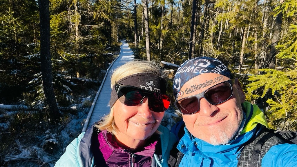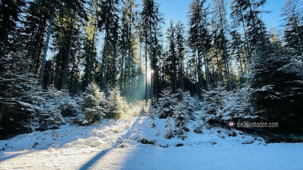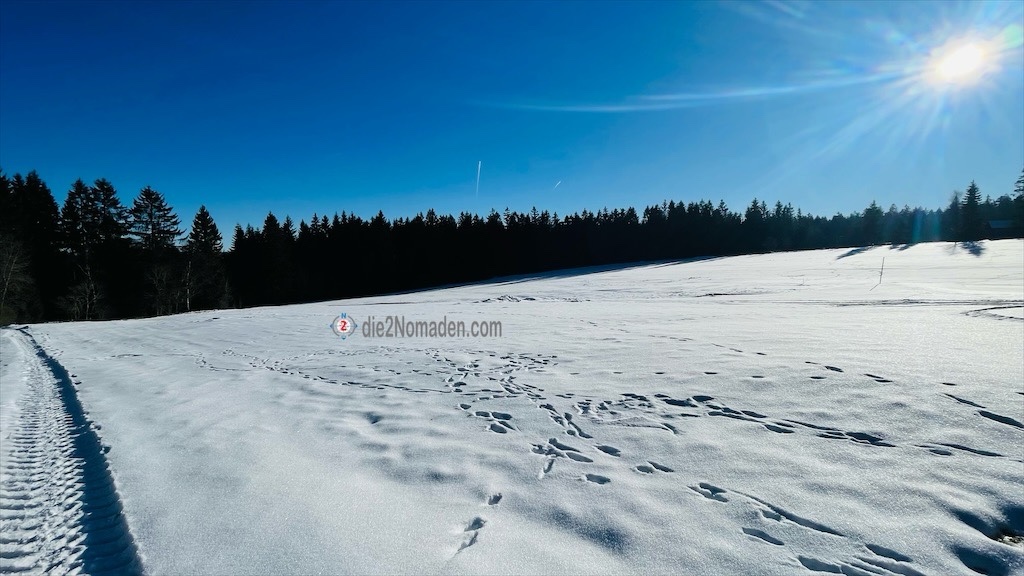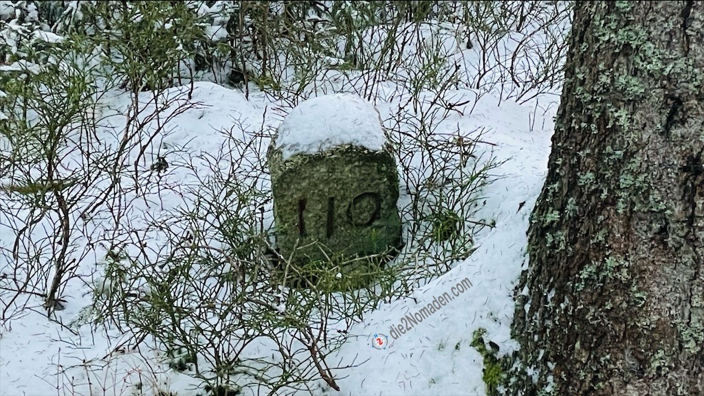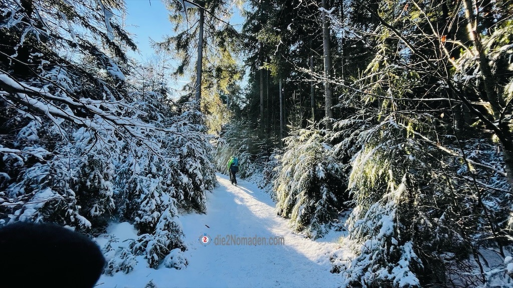 Hier passiert mir ein Missgeschick, ich rutsche auf einer vereisten Rille aus und kann mich mit viel Geschick zum Glück noch vor einem Sturz bewahren. Doch meine GPS-Uhr dürfte einen Notfall erkannt haben, hat die aktuelle Tour gespeichert und beginnt, wie verrückt zu läuten, piepsen und vibrieren. Bis ich alle Schichten entfernt und endlich meine Uhr freigeschichtet habe um den Alarm abzustellen, wurde bereits mein Notfallkontakt, zum Glück die Frau Nomadin, informiert. 🫣