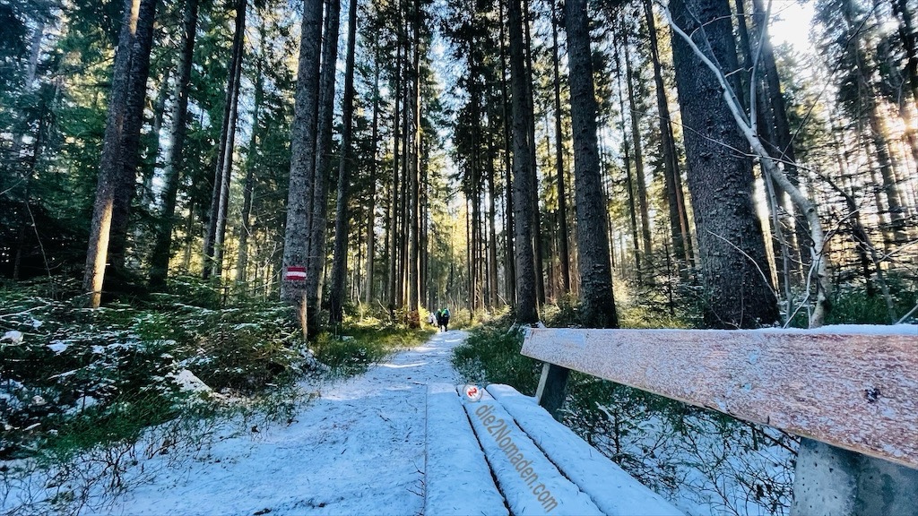 Am letzten Parkplatz vor der Grenze stapfen wir wieder frisch-fröhlich rechts in den Wald, in die Bayrische Au. Der Forstweg ist teilweise ziemlich vereist und geht, etwa bei Gesamtkilometer 6 in einen hölzernen Steg über.