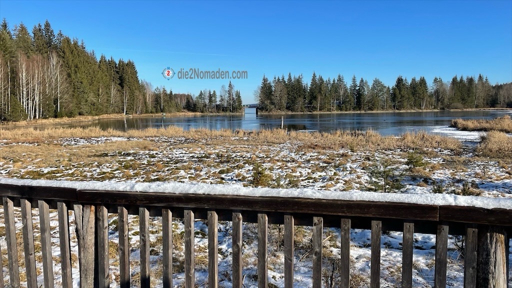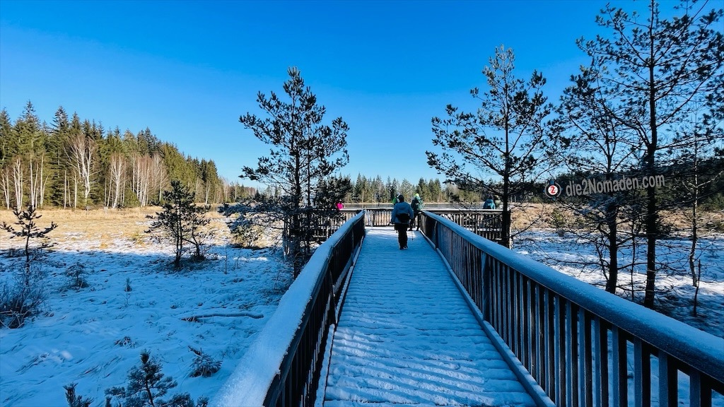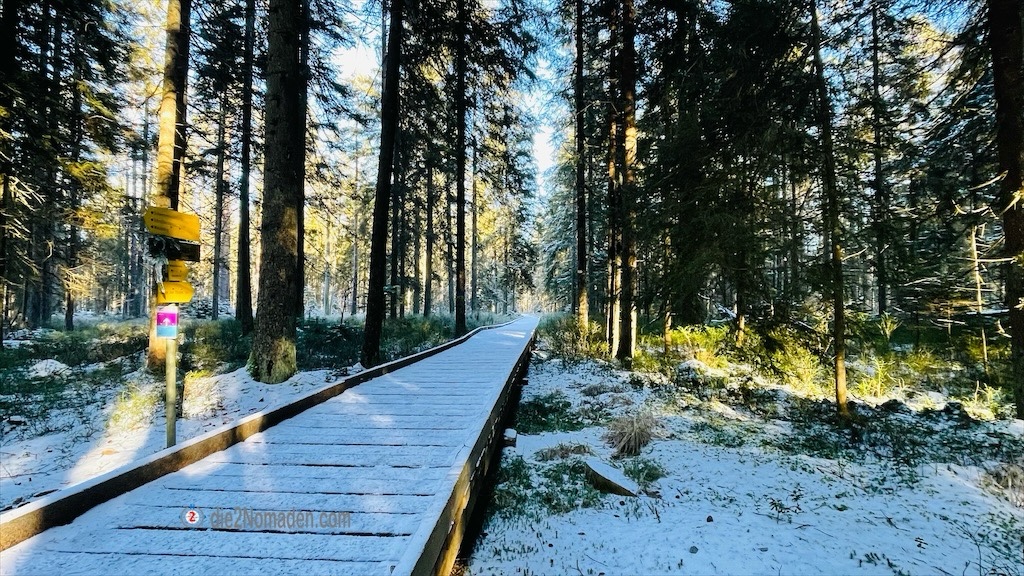 Dieser 700m lange Pfahlbauten-Steg wurde, im Zuge der hydrologischen Sanierung des Hochmoores im Jahre 2018, als Naturerlebnisweg und Moorlehrpfad erbaut und bringt uns zu einer T-förmigen Plattform mit Ausblick auf den Moldaustausee in Tschechien