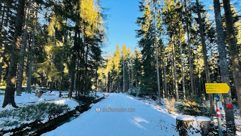 Für uns geht es nun im Zick-Zack durch das Naturwaldreservat immer entlang der Grenze zu Tschechien. Vier Kilometer später kommen wir wieder auf den Begleitweg des Schwemmkanals und begleiten so das sprudelnde Wasser, bis es sich linksseitig, bei der Robert-Baldassari-Hütte (Hütte ist wohl etwas übertrieben, wohl eher ein Unterstand) in die Tschechei verabschiedet.