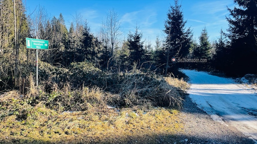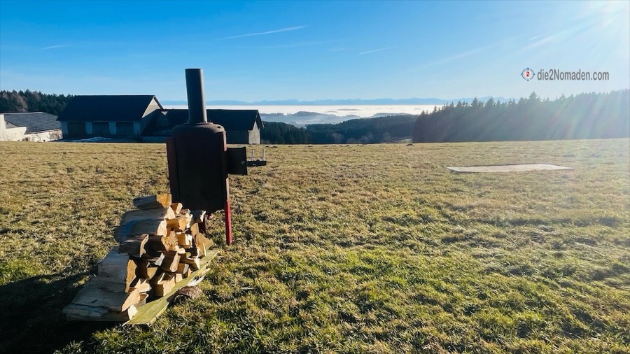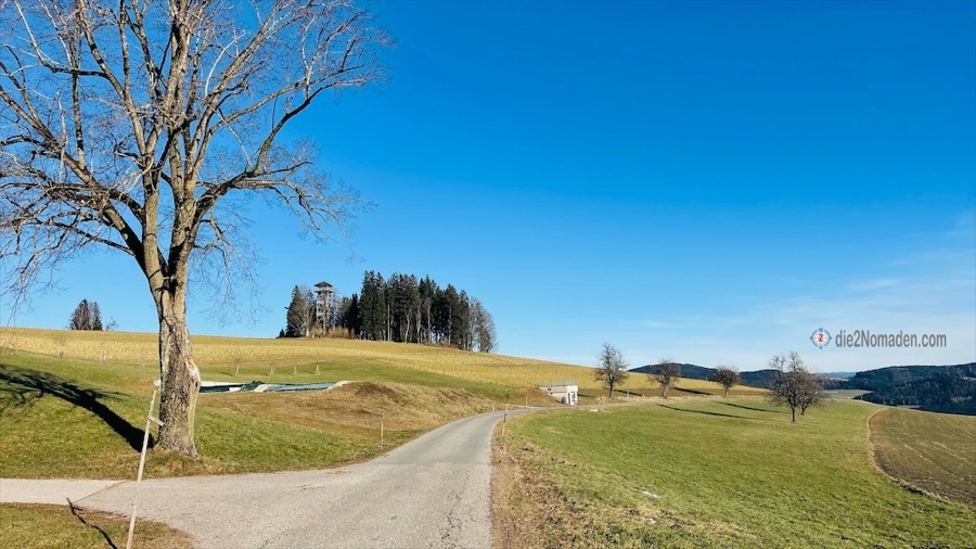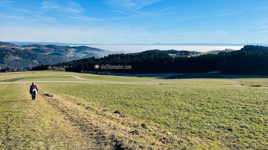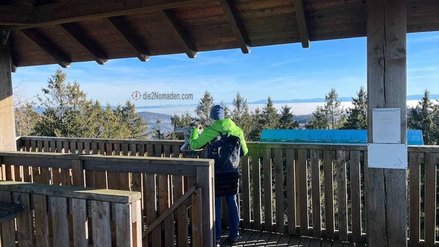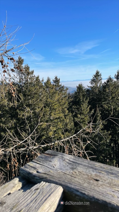 Mit der Sonne im Gesicht oder im Rücken geht es dahin auf Wanderwegen oder auch ganz wenig befahrenen Straßen und dann sehen wir schon von Weitem die Aussichtswarte. Ein Abstecher hinauf in ein kleines Wäldchen und hier erblicken wir zum ersten Mal die dicke Nebeldecke, die wie eine kuschlige, weiße Daunendecke über den Tälern liegt.