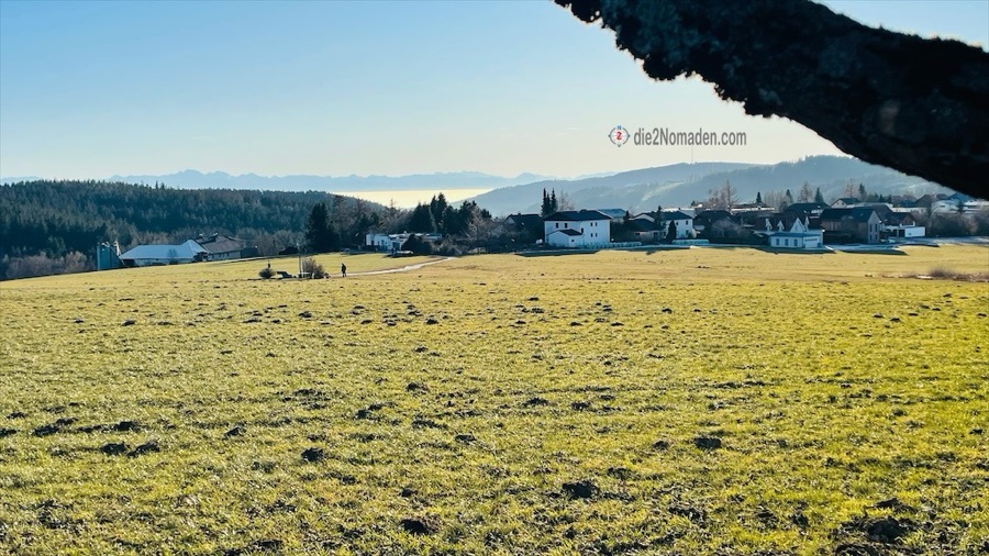 Nach einigen genussvollen Minuten verlassen wir die Plattform wieder und runter gehts zur Straße, die wir dann gegen einen Wald- und Wiesenweg tauschen. Munteren Schrittes (jaaaa, da kann auch ich wieder sprechen) gehts hinein in den Wald, auf der anderen Seite (in einfachen Worten erklärt) wieder hinaus und wir staunen ob der wunderbaren Aussicht hier oben, beneiden diejenigen, die diese Umgebung ihr Zuhause nennen und marschieren wieder hinein in ein Waldstück.
