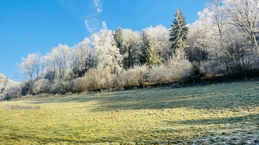 HELLMONSÖDT. Es sollte nicht weit zu fahren sein, aber trotzdem die Sonne scheinen und da wir sowieso warten müssen, haben wir Zeit, die Webcams zu studieren. Machen wir eigentlich sehr oft so. In Hellmonsödt scheint die Sonne und nachdem wir meiner Schwägerin noch Zeit zum Ankommen und Umziehen lassen, starten wir einige Zeit später zu viert los ins Mühlviertel. In Linz bzw. Linz-Urfahr ist noch dicker Nebel, aber Mitte des Haselgrabens erblicken wir sie – die liebe Sonne, die die mit Raureif bedeckten Bäume zum Glitzern bringt.