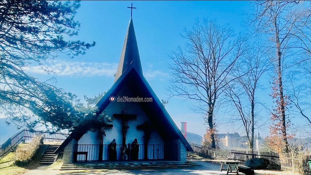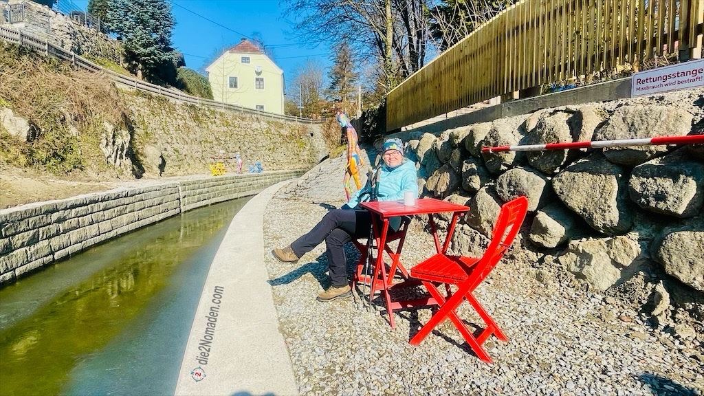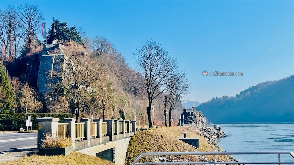 Hier ist an einem Zulauf eine kleine künstlerische Arbeit zu sehen. Einige bunte Stühle und noch buntere Schaufensterpuppen stehen im Schotter. Nett anzusehen, über den Sinn der Sache haben wir nichts herausgefunden bzw. auch nicht danach gesucht. Für uns geht es weiter ein paar Stufen bergan zum Kalvarienberg. Ein schöner Aussichtsplatz mit Blick über die Donau und die Stadt Grein.
