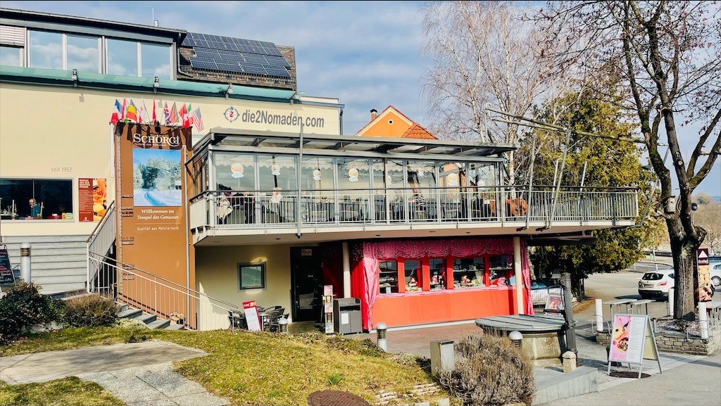 Wir kommen direkt beim Schörgi, den wohl jeder kennt, hinunter zur Donau und kehren natürlich ein, auch wenn es grad kein Eis gibt, dafür mega tolle Mehlspeisen, wie Orange-Nougat-Krapfen und Heidelbeerstrudel.