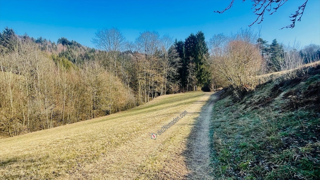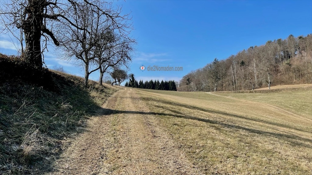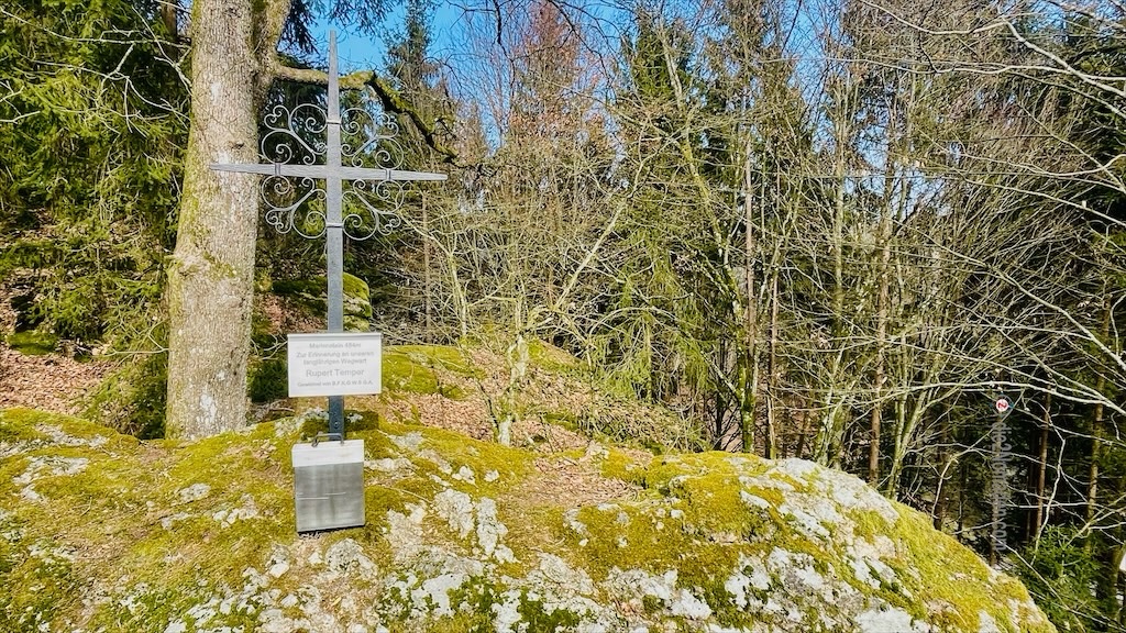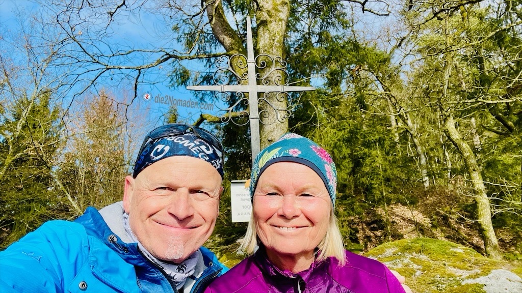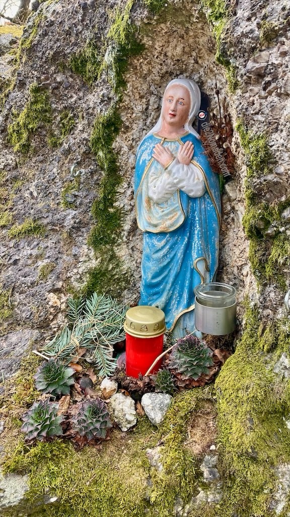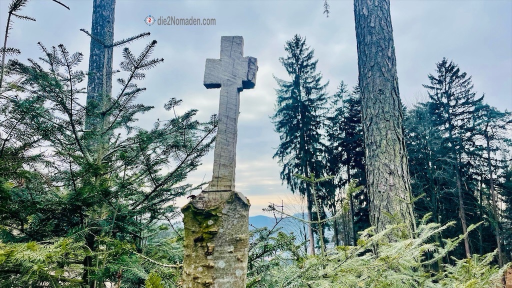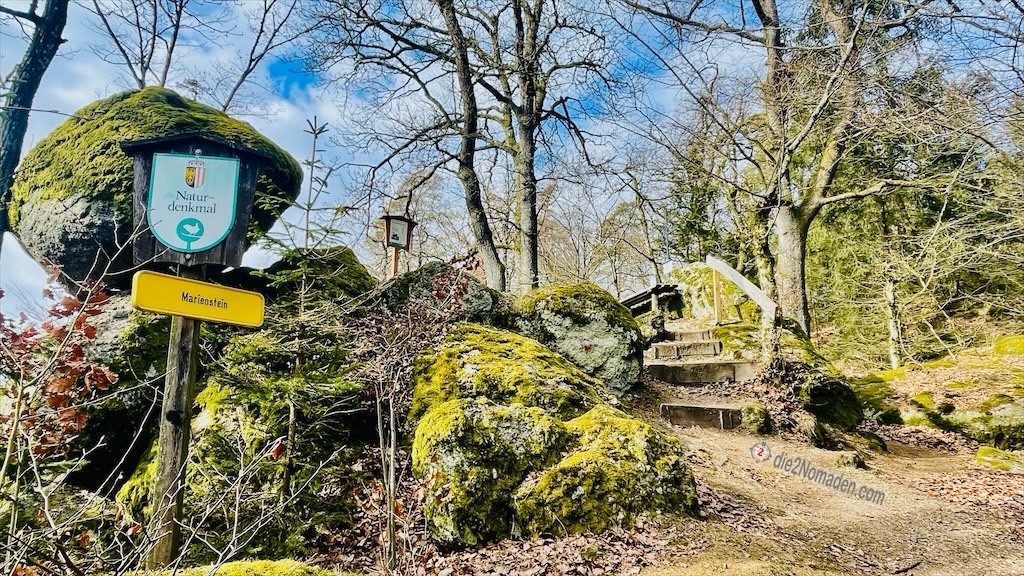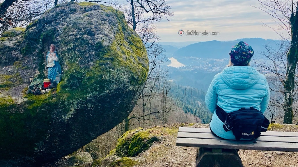 Dann geht es sanft weiter durch ein Waldstück und über Wiesenwege, immer entlang der Markierung Marienstein, den wir auch kurze Zeit später entdecken. Ein Naturdenkmal mit einem großen Felsklotz, einem sogenannten Wackelstein, in dem eine Marienstatue eingelassen wurde, ein kleines Gipfelkreuz und ein Bankerl mit wunderbarem Fernblick über die Donau hinaus ins Land. Wir ergattern hier die letzten Sonnenstrahlen des Tages und die Sicht trübt sich, leider schon viel früher als prognostiziert, ein.