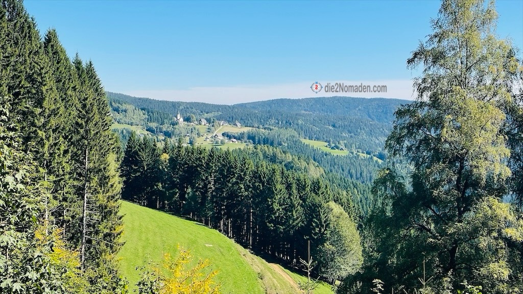Auf halbem Weg erreiche ich das sehr abgeschiedene Bergdorf Laßnighube, von wo ich eine wunderbare Aussicht auf die tiefgrünen Almweiden der Koralpe habe.