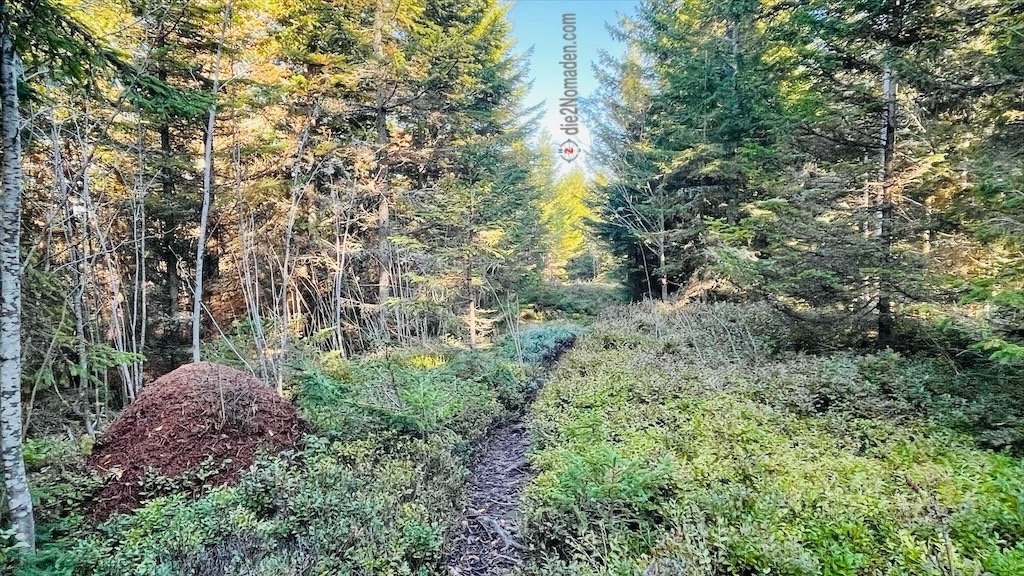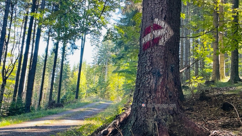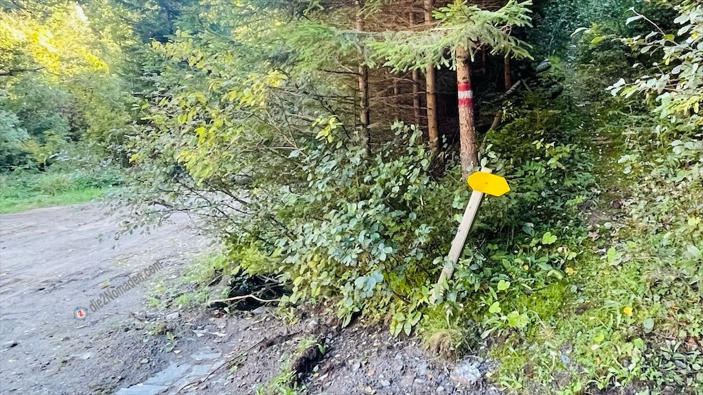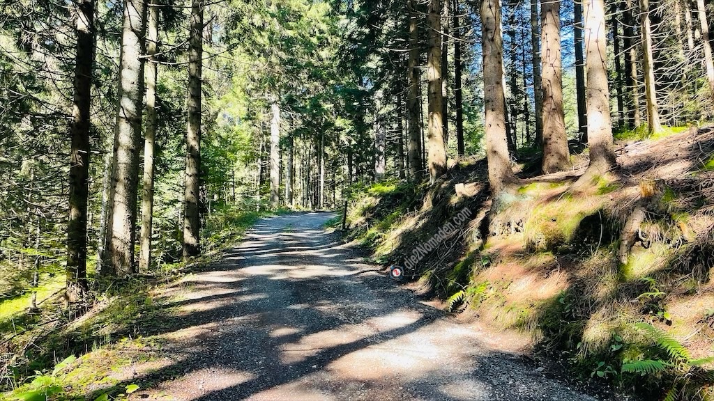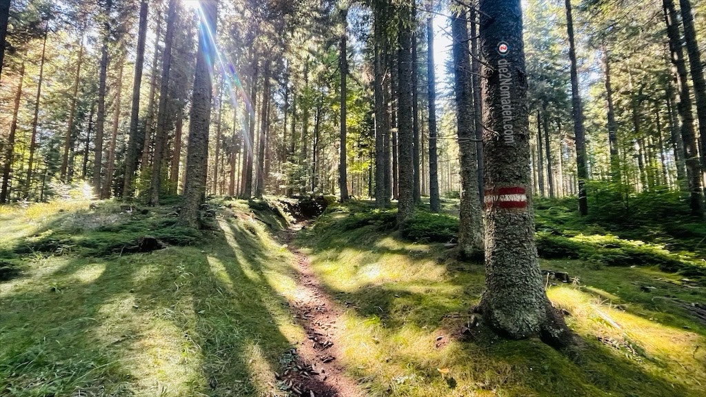 Nach meiner vollständigen Adjustierung und einigen Fotos verabschiede ich mich von meinem Schatz und stapfe, der Beschilderung „Jakobsweg“ folgend, los. Durch dichte Fichtenwälder geht es südwärts zum Stausee Soboth.