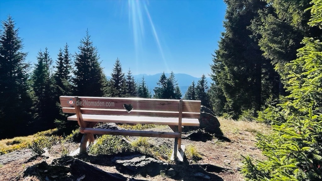 Gemütlich wandere ich bergauf, vorbei an der Baustelle für eine neue Windkraftanlage, wo der Weg durch dichte Heidelbeerfeld-Sträucher umverlegt wurde und erreiche den Gipfel, der die Grenze zwischen Slowenien und Österreich markiert. Hier heroben bietet sich, obwohl umgeben vom dichten Grün der Bäume, eine wunderbare Aussicht bis hin zu den Julischen und Karnischen Alpen.