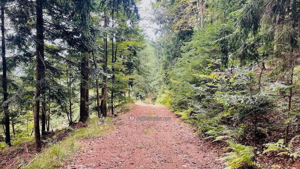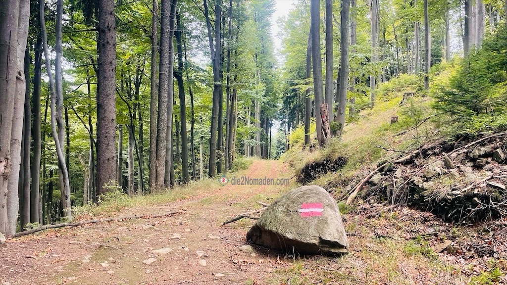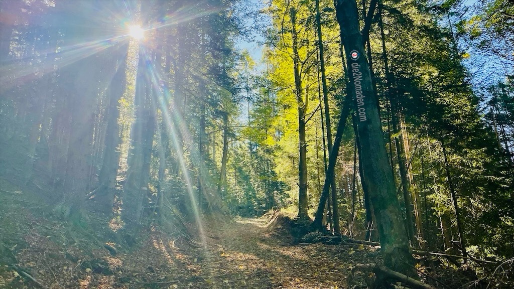 Meine vorgesehene Pause fiel wesentlich kürzer aus, als geplant. Hier weht ein eiskalter Wind und zwingt mich (um nicht krank zu werden) zum Weiterwandern. Nach einer kurzen Stärkung führt mich nun der Weg gleich wieder steil, durch scheinbar endlose Wälder, bergauf. Außerdem schob nun der Wind kontinuierlich Wolken vor die Sonne.