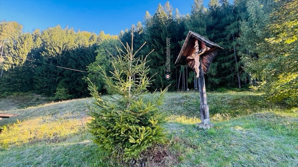 Vorbei an hölzernen Marterl geht es nun für mich wellenförmig, auf verwachsenen, teils kaum begehbaren Wegen stetig bergab, bis ich kurz vor der Ortschaft St. Lorenzen, welche ich rechtsseitig umgehe, aus dem bewaldeten Bereich herauskomme. Entlang saftigen Wiesen wandernd, lohnt sich ein kurzer Blick zurück, der die, auf einem Hügel liegende, idyllisch gelegene Kirche St. Laurenzen freigibt.