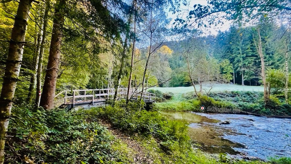 Der 2. Tag beginnt gleich mit einem steilen Abstieg durch einen schier endlos scheinenden Nadelwald. Es galt aufzupassen, denn der Weg war stellenweise gefroren und sehr rutschig, und so erreiche ich die tiefste Stelle dieses Abschnittes, das mystisch schöne Zweibachtal. Hier treffen sich der Krumbach und die Feistritz. Auf der sogenannten Märchenwiese, einem paradiesisch grünen Feuchtbiotop, kann man ein wenig rasten, denn das bringt Kraft, die man für den kommenden steilen Aufstieg in Richtung St. Lorenzen braucht.
