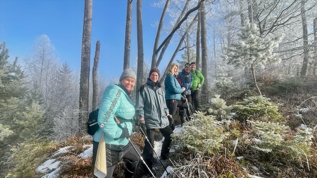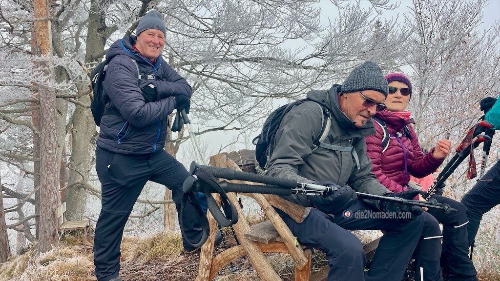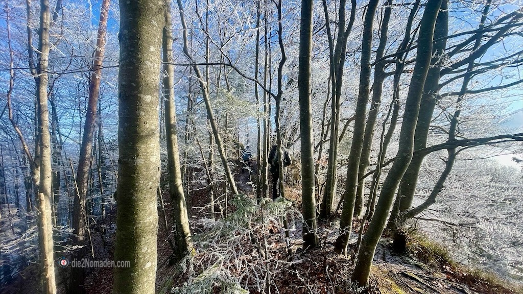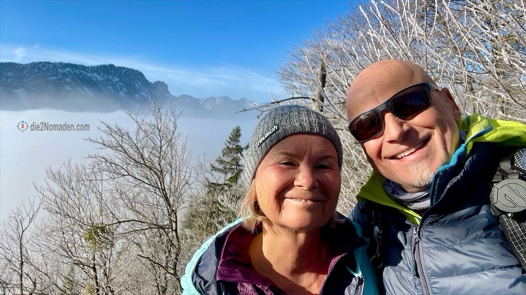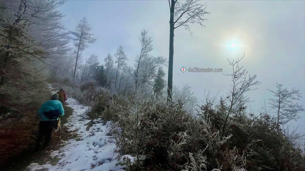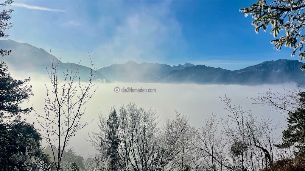 Kurz vor unserem ersten Ziel, dem Gipfel des Kienbergs haben wir das Ende der Nebeldecke erreicht und staunen nicht schlecht über den Anblick des wunderschönen blauen Himmels, der Bergkette und dem tollen Blick auf die flauschige Nebeldecke.