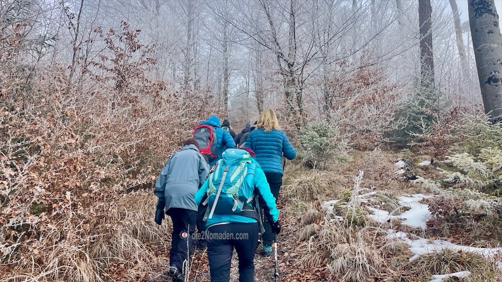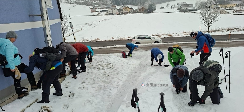 Gleich bei der ersten Steigung gab es die erste unfreiwillige Pause, alle haben die „Ketten“, sprich Grödl angelegt. Dann zog sich der Weg gemächlich den Hang hinauf.