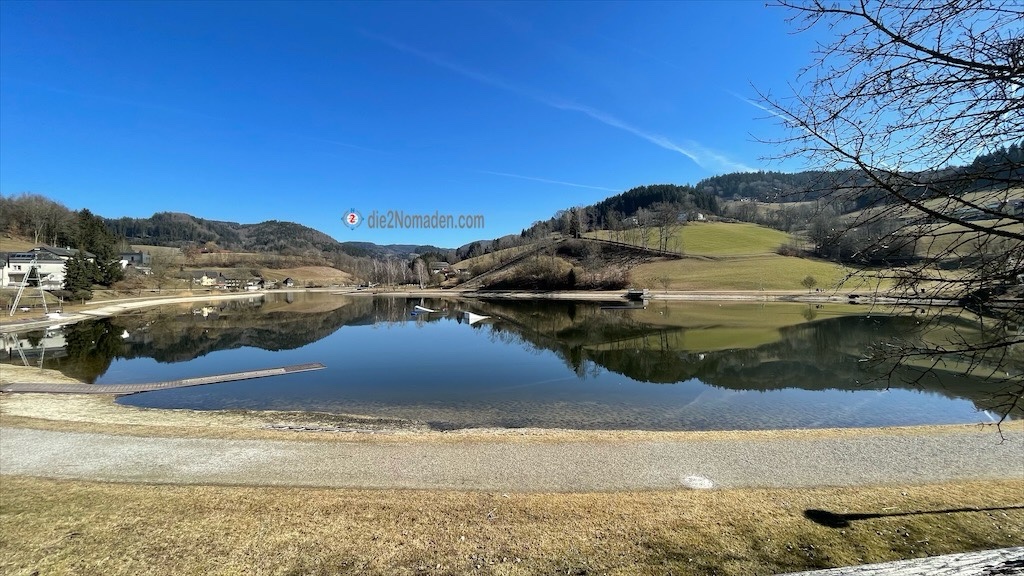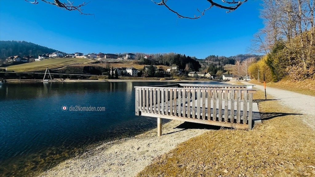 Nach einer kurzen Trinkpause geht es für uns wieder weiter in Richtung Waldhausen, das wir dann nach kurzer Zeit erreichen. Der glitzernde Naturbadesee und der angrenzende Parkplatz sind das Ziel unserer heutigen Wandertour.
