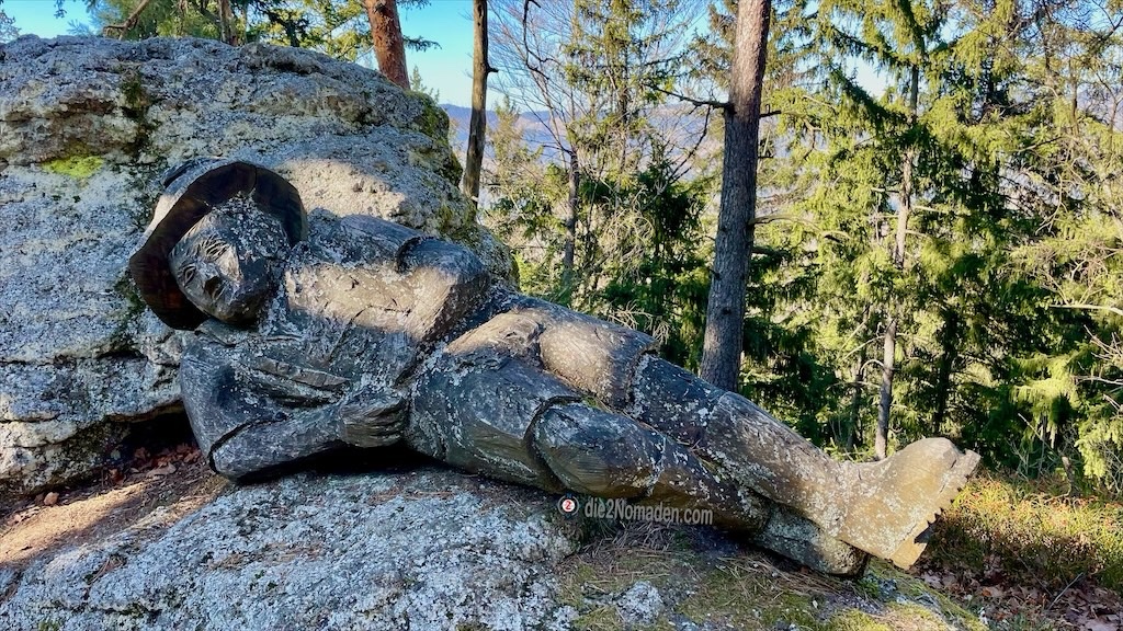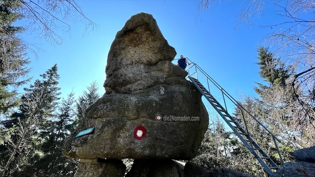 So gestärkt haben wir dann nicht mehr weit und wir erreichen den doch sehr eindrucksvollen, riesigen Schafstein mit der Eisenleiter. Natürlich muss dieser mächtige Stein erklommen werden und wir kraxeln alle hinauf. Rundherum sind zwar die Bäume schon ziemlich hoch, aber trotzdem erspäht man noch den ein oder anderen Ausblick.