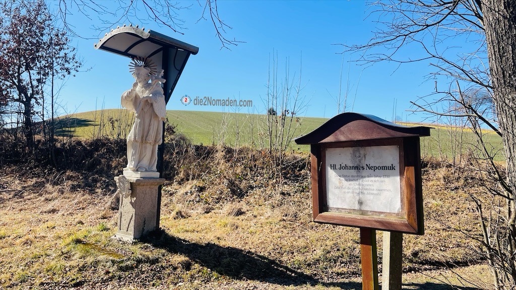 Dann gehts wirklich los, allerdings kommen wir nicht weit, weil wir auch die Kapelle, die am Wegesrand beschrieben ist, besichtigen wollen. So gehts gleich ein unscheinbares Wegerl hinauf und wir sehen die Kapelle. Allerdings verwundert uns etwas die Wäsche, die vor der Kapelle im Wind flattert. Hat der Herr Pfarrer heut Waschtag? Dann wollen wir nicht stören und gehen gleich wieder runter, studieren noch einmal genau die Tafel und … wer lesen kann, ist klar im Vorteil.