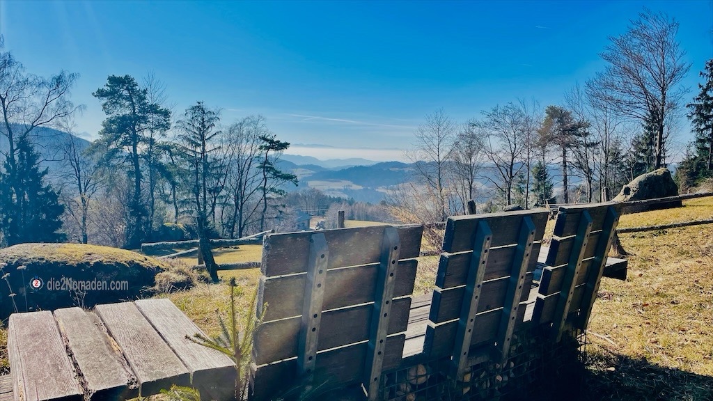 Zu unserem Glück treffen wir auf einen wunderbaren Rastplatz mit zwei Bankerl und einer traumhaften Aussicht. Die mitgebrachte Stärkung wird ausgepackt und da kein anderer weit und breit zu sehen ist, flattert auch mein T-Shirt schon bald über einem Zaun im Wind, die Jacke ist schon lange weg.