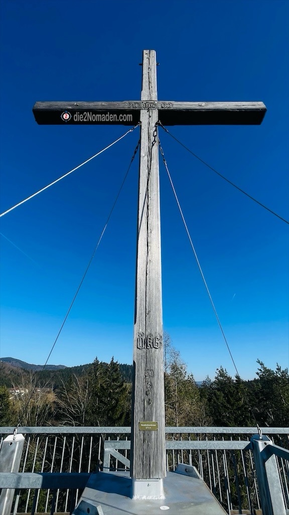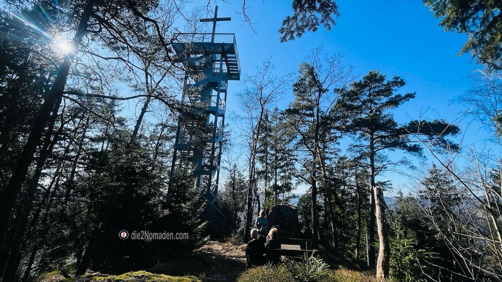 Bald erreichen wir das Heimkehrerkreuz: Nach dem Zweiten Weltkrieg von heimkehrenden Soldaten errichtet, wurde das zwölf Meter hohe Kreuz 2002 abgetragen und durch die gleich hohe Aussichtswarte mitsamt etwa drei Meter hohem Holzkreuz ersetzt. Von hier oben hat man wirklich einen traumhaften Ausblick in alle Himmelsrichtungen und natürlich auch hinunter nach Waldhausen. Am Fuße der Warte liegt aus Holz geschnitzt einer der Heimkehrer. Auch ein Rastplatz ist hier angebracht.